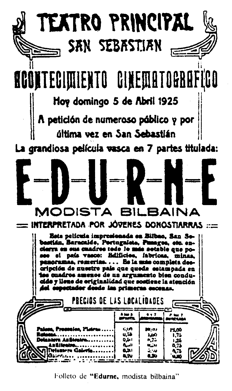 Una de las primeras películas de Bilbao se proyectó en este cine, que en 1923 pasó a ser el cine Bilbao. Fue Edurne modistilla bilbaína, de 1924, dirigida y protagonizada por Telesforo gil. Desgraciadamente, hoy sólo se conservan descartes, el guión y algunas fotografías. Una copia fue cedida por Telesforo Gil a una marca de chocolate muy popular asociado a la merienda de los niños. Se dividió en fotogramas que se insertaron en los envoltorios de los caramelos como elemento publicitario. Los que la comprasen, podían ver cada fotograma mediante una especie de visor de plástico con el que se vendía, un embudo visual contra la luz. Al parecer, el cineasta pensó que había entregado tan solo descartes, no una copia original de su película.
