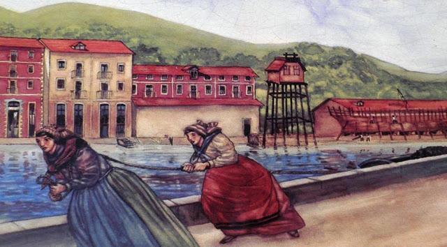 La Ría de Bilbao contaba a finales del siglo XIX con 14 kilómetros hábiles de muelles y diques desde el Abra en su desembocadura hasta el Arenal bilbaíno. Desde Olabeaga, trabajaban las sirgueras, una cuadrilla de mujeres, de dos a cuatro, que arrastraban en hilera las gabarras mediante unas maromas que llevaban ceñidas al cuerpo con un tirante. Todo este esfuerzo era necesario porque todos los barcos no podían ascender por el cauce de la ria y por ello se pasaba la mercancía a gabarras, que si podían subir el curso de la ría. Este trabajo eran de una gran crudeza y dureza. Se denunció en varias ocasiones que lo realizasen mujeres, que siempre eran pertenecientes a las clases mas bajas de la sociedad.